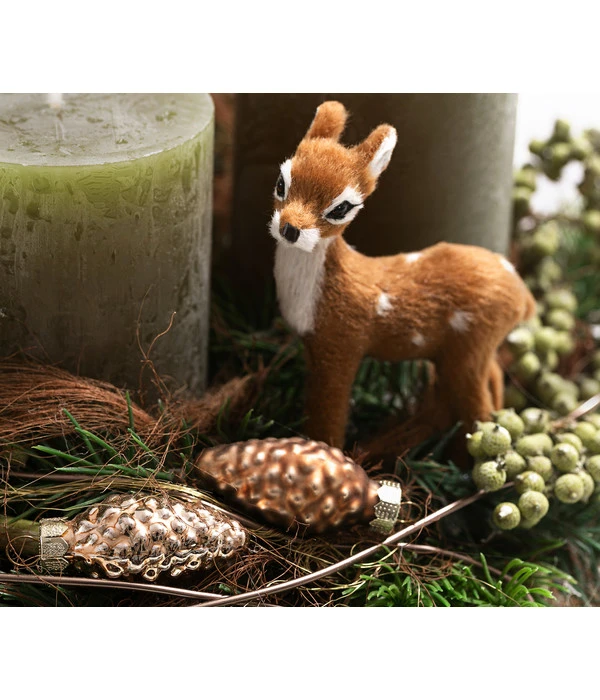Adventsgesteck ja, aber bitte nicht null-acht-fünfzehn! Diese Aussage könnte von Ihnen stammen, denn Sie lieben aktuelle Trends und sind stets auf der Suche nach spannenden, neuen Ideen? Dann gönnen Sie sich doch in diesem Jahr ein Adventsgesteck Ebony. Denn hier sitzt die Deko nicht in einer Schale und auch nicht auf einem klassischen Kranz. Hier vereinen sich vielmehr trendstarke Deko-Elemente in einer auffallend schönen Jardiniere zu einem vorweihnachtlichen Schmuckstück. Und Sie haben es schon gelesen: Das Arrangement besteht aus den verschiedensten Materialien in topaktuellen Naturtönen. Schließlich ist aus gutem Grunde gerade alles „in”, was uns unsere Natur an dekorativen Highlights so schenkt. Bei Ebony vereinen sich realistisch nachempfundene Zweige, Zapfen und Glaszapfen mit einer rustikalen Kordel aus Jute und vier olivgrüne Kerzen. Absoluter Hingucker ist natürlich das zauberhafte Rehkitz, das neugierig in die Welt da draußen blickt. Greifen Sie zu, holen Sie sich Ihr Adventsgesteck Ebony nach Hause.