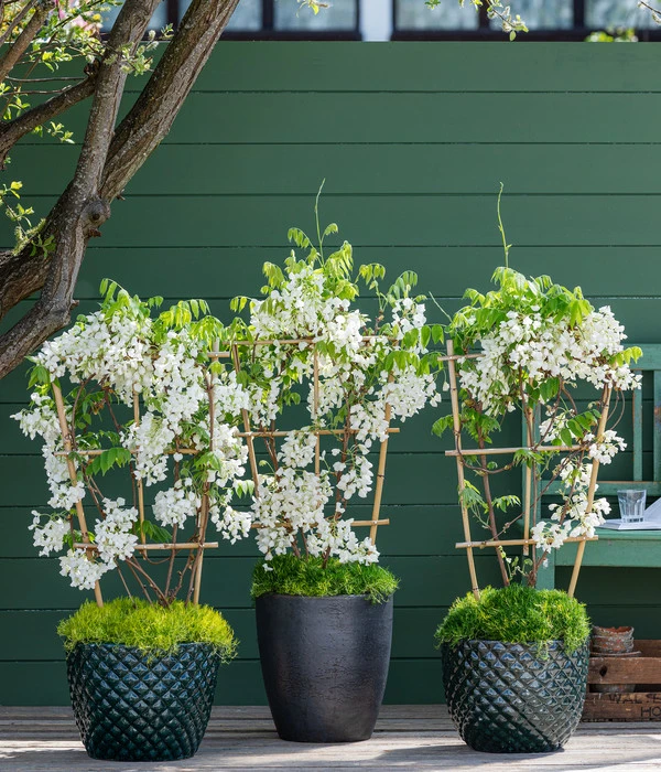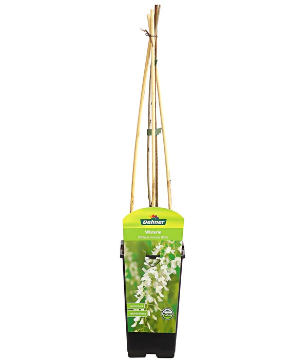 Weiß wie frisch gefallener Schnee leuchten die prächtigen Blütentrauben in der Maisonne und erinnern an edle Perlen. Und kostbar ist der Blütenreichtum der Glyzinie auf jeden Fall, denn kaum eine andere Gartenpflanze prangt in den Monaten Mai und Juni schon in voller Blütenpracht und kann es mit der Kletterpflanze an Dekorationswirkung aufnehmen. Ein Chinesischer Blauregen, wie diese Glyzinie trotz ihrer weißen Blüten genannt wird, ist eine Gartenpflanze, die ganz neue Möglichkeiten der Gestaltung eröffnet – für Häuser wie für Gärten. Denn die Kletterpflanze verfügt über eine schier ungebremste Wuchsfreude und klettert an Haus- und Sichtschutzwänden bis in 8 Meter Höhe. Die Glyzinie will mit ihrer Wuchskraft aber nicht nur hoch hinaus, sondern kann mit ihren langen Ranken auch Pergolen und Laubengänge schmücken – erst mit der weißen, herrlich duftenden Blütenpracht, später mit ihren sommergrünen, hübsch gefiederten Blättern, die sich im Herbst goldgelb färben.