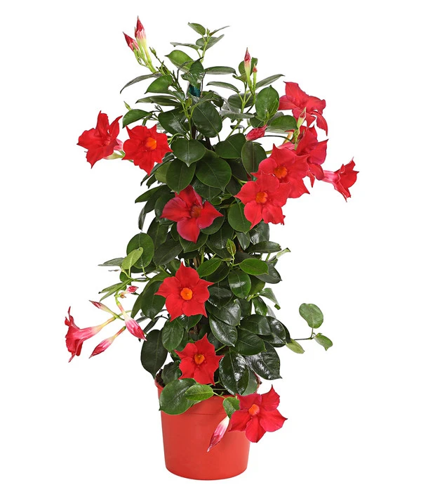 Ein Blick auf die großen, trichterförmigen Blüten und deren leuchtende Farbe war ausreichend, um Sie vollkommen gefangen zu nehmen? Damit sind Sie nicht alleine, denn ihre blütenreiche Schönheit macht die Dipladenie zu einer der beliebtesten Kübelpflanzen auf unseren Terrassen, Balkonen und vielleicht sogar im Vorgarten. Und das liegt nicht nur an der Vollkommenheit jeder einzelnen Blüte mit ihrer samtigen Oberfläche und dem gelblichen Schlund. Es liegt auch an ihrem Blütenreichtum, der im Kontrast zum kräftig grünen, glänzenden Laub besonders strahlend zur Schau getragen wird. Die fantastische Ausdauer macht ihren Auftritt schließlich vollkommen: Ihre Dipladenie wird unermüdlich von April bis Oktober blühen. Sie erhalten eine Pflanze in Pyramidenform. So kann sie Ihnen ihre Blütenfülle als Kletterpflanze bestmöglich präsentieren. Genau das wollen Sie bei sich genießen? Nur zu, Sie müssen sich auch nicht auf eine einzige Dipladenie beschränken!