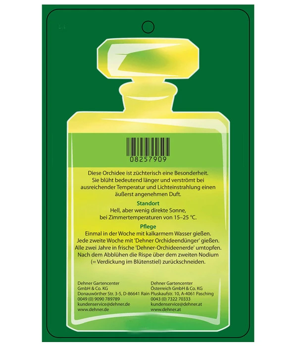 Wie ein kostbarer Parfum-Flakon, in dessen geschliffenem Glas sich die Sonnenstrahlen fangen und ein ganzes Zimmer zum Strahlen bringen, leuchten die edlen Blüten dieser Orchideen-Rarität. Und so anmutig die dicht besetzten Blütenrispen wirken, so elegant ist auch der blumige Duft, mit dem diese spektakuläre Neuzüchtung am optimalen Standort Ihre Sinne betören wird. Kein Wunder, dass diese Duft-Orchidee den schönen Namen ‘Flacon Solaire‘ tragen darf. Doch neben den an ein teures Parfum erinnernden Duftnoten wird Sie die exotische Pflanze auch mit einer außergewöhnlich langen Blütezeit beglücken. Und das, ohne sich als übermäßig anspruchsvoll zu erweisen. Lassen Sie deshalb die Duft-Orchidee ‘Flacon Solaire‘ ihren sinnlichen Reiz auch in Ihrem Wohnambiente entfalten und genießen Sie die faszinierende Ausstrahlung dieses kostbaren Schmuckstücks!