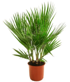 Aus ihrer ursprünglichen Heimat hat diese Fächerpalme ihre Liebe zur Sonne mitgebracht. Geben Sie ihr deshalb einen möglichst hellen, sonnigen Platz, dann wird sie immer neue, prächtige Wedel bilden. Während der Hauptwachstumsphase muss die Washingtonia reichlich gegossen werden, die Erde sollte zwar zwischen den Gießgängen an-, aber nie ganz eintrocknen. Keinesfalls sollte überschüssiges Wasser im Topf stehen bleiben. Eine Düngerzugabe vom Frühjahr bis zum Herbst fördert das gesunde Wachstum. Als Substrat zum Umtopfen empfehlen wir die Dehner Pflanzerde. Wegen der langen Pfahlwurzel braucht die Palme übrigens einen eher hohen als breiten Topf. Da diese Palmenart nur bis etwa -5°C frostfest ist, sollten Sie ihr vor Beginn es Winters einen sehr warmen Mantel anziehen oder an hellen, kühlen Orten bei etwa 10° C überwintern. Während dieser Ruhephase wird die Palme nicht gedüngt und nur sehr sparsam gegossen.