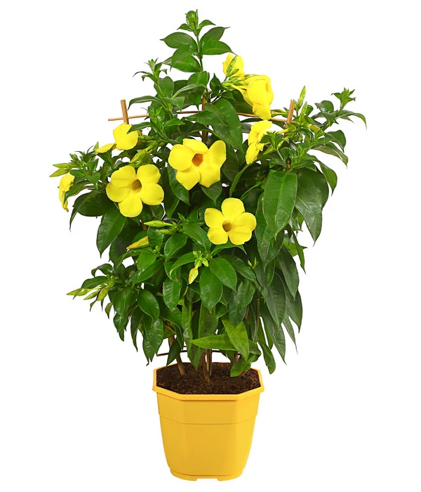 Ihre Fans sind sich einig: Die Goldtrompete ist eine der schönsten Kletterpflanzen und macht der bekannteren Dipladenie, der sie ein wenig ähnelt, echte Konkurrenz. Im Gegensatz zur Dipladenie schmückt sich die Allamanda cathartica mit sonnengelben, trompetenartigen Blüten, die im Sommer über dem glänzenden, sattgrünen Laub leuchten. Was muss das erst für ein fantastischer Anblick sein, wenn man die Pflanze am Naturstandort in den undurchdringlichen Regenwäldern Brasilien entdeckt, wo die zahlreichen Blüten in dem Halbdunkel besonders hell leuchten! Aber auch in unseren Wohnungen hier in Mitteleuropa ist die Goldtrompete ein Blickmagnet im Raum. Vor allem, weil sie nicht nur eine ungebremste Blühfreude zeigt, sondern auch vor Wachstumsenergie nur so sprüht und in Windeseile an einem Spalier oder einer anderen Kletterhilfe bis in Höhen von 200 cm klettert. Gönnen auch Sie sich den Anblick dieser traumhaft schönen Tropenpflanze, die auch unter dem Namen Dschungelglocke bekannt ist.