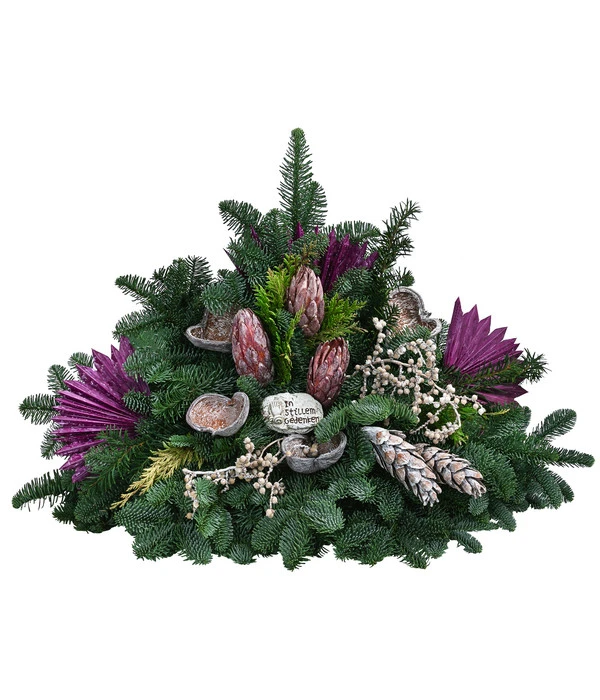 Im Herbst und im Winter sind Tannenzweige und Kiefernzapfen oft wichtige Bestandteile des Grabschmucks. Langlebige Protea-Blüten und eine Palmsonne dienen als edle Details und geben dem Grabbukett eine besonders schöne Symmetrie. Das prachtvoll gestaltete Bukett eignet sich aufgrund der Größe und des Designs ganz besonders für große Grabstätten. Zudem erhält es durch das frische Grün einen lebendigen, natürlichen Charakter. Ein wertiger Gedenkstein aus witterungsbeständigem Polyresin überbringt eine liebevolle Botschaft an den Verstorbenen. Halten Sie die Erinnerung wach und lebendig und schaffen Sie mit dem ansprechenden Grabbukett einen dekorativen Lichtblick.