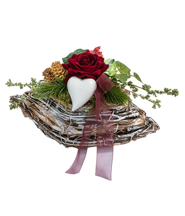 Mit dem Grabgesteck Bristol von Dehner erhalten Sie einen handgefertigten und stilvollen Schmuck, um Ihrer Lieben zu gedenken. Gerade zu besonderen Feier- und Gedenktagen wie Allerheiligen, Allerseelen oder Totensonntag spendet diese dezente Dekoration Trost und sendet einen edel geschmückten Gruß. Die feine Whitewash-Optik verleiht dem Gesteck Bristol einen ebenso modernen wie hochwertigen Look. Dabei bilden das weiße Herz und das intensive Rot der Seidenrose einen glänzenden Mittelpunkt, der ausgezeichnet mit dem satten Grün der künstlichen Tannenzweige harmoniert.