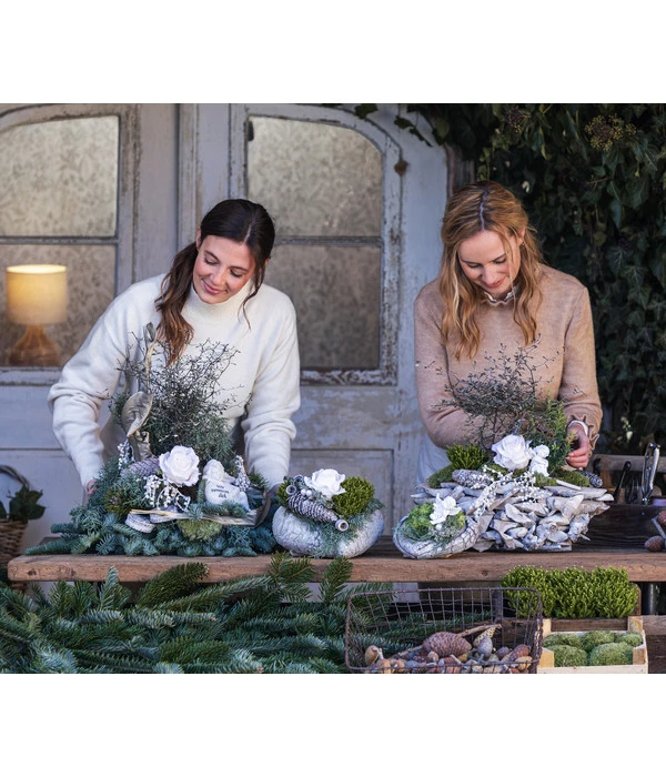 Auf einem üppigen Bett aus frischen Tannen- und Kiefernzweigen wurden erlesene Deko-Elemente wie eine weiße Kunstrose, getrocknete Palmblätter, Fichtenzapfen und Zweige, aber auch Polstermoos, Canella und Co stilvoll platziert. Dank der bizarren Zweige des Zickzack-Strauchs (Corokia) und dem prachtvollen Strelitzienblatt erreicht das Gesteck eine stattliche Höhe von ca. 55 cm, sodass sich das Grabgesteck Stille auch als Winterschmuck für größere Grabstätten und Familiengräber eignet. Den liebenswerten Blickfang der Komposition aber bildet die kleine Engelsfigur mit Trauerspruch, die als geheimnisvoller Mittler zwischen Himmel und Erde gilt. Da unsere Floristen bei der Wahl der Materialien aber nicht nur auf den dekorativen Wert, sondern auch auf die Haltbarkeit geachtet haben, können Sie sicher sein, dass das Grabgesteck Stille auch Regen, Frost und Schnee ungerührt über sich ergehen lassen wird und das Grab Ihrer Lieben zuverlässig schmücken wird – bis ins neue Jahr hinein.