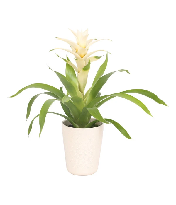 Eine Überraschung auch für Kenner exotischer Pflanzen: Die Guzmanie ‘Deseo White‘ stellt nicht leuchtend orangefarbene oder rote Blüten zur Schau, sondern präsentiert sich mit einem prachtvollen, fontänenartigen Blütenstand in elegantem Weiß. Und weil wir Ihnen diese zur Familie der Bromeliengewächse gehörende Tropenpflanze gleich zusammen mit einem hochwertigen Keramiktopf in ähnlichem Weißton anbieten, haben Sie mit der Guzmania ein botanisches Highlight, das sich auch als stilvolles Geschenk für alle Freunde exotischer Pflanzenschätze eignet. Denn diese Tropenschönheit begeistert ihre Fans auch durch eine enorm lange Blütezeit von bis zu 100 Tagen. Machen Sie sich und anderen eine besondere Freude – mit der strahlend schönen Guzmanie ‘Deseo White‘ in Keramik!