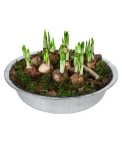 Wer nun denkt, die ‚Tête à Tête‘-Narzissen seien das einzige Highlight dieses Arrangements, der irrt. Auch die Zinkschale ist ein Hingucker und wenn Sie die Blumenzwiebeln irgendwann aus der Schale nehmen möchten, leistet das Gefäß Ihnen weiterhin treue Dienste. In so eine Zinkschale passen nach den Narzissen natürlich andere Blumen, Sie können sie aber auch für Trockenblumen-Arrangements nutzen oder im Winter darin einen kleinen Adventskranz gestalten. Haben Sie schon eine Idee, wo Ihre Zinkschale mit Narzissen stehen soll? Dann sichern Sie sich Ihr Exemplar gleich oder rahmen Sie direkt mit mehreren Schalen den Eingangsbereich ein.