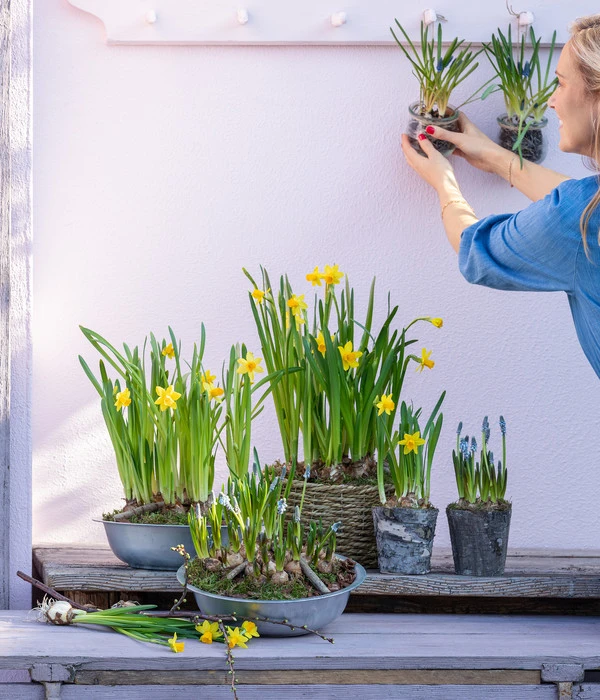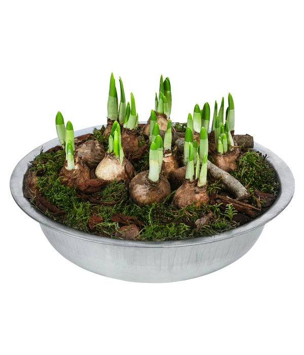 Der Frühling steht vor der Tür, aber Sie haben einfach keine Idee für pflegeleichte Frühlingsdeko? Kein Problem, denn diese Zinkschale kommt schon fertig bepflanzt und dekoriert zu Ihnen. Das wunderschöne Arrangement beherbergt nicht nur ‚Tête à Tête‘-Narzissen, sondern wurde auch mit Moos und Rindenstücken abgedeckt für eine besonders naturnahe Optik. Ob im Eingangsbereich, auf einem Tisch draußen oder neben einer schönen Gartenbank: lassen Sie die Zinkschale mit Narzissen wirken. Denn sobald die Blumen ihre gelben Blüten zeigen, geht bei Ihnen Zuhause die Sonne auf und der Frühling hält endgültig Einzug. Das liebevoll gestaltete Ensemble zeigt dabei nicht nur die robuste Schönheit der Natur, sondern auch, wie sehr Blumen unsere Stimmung aufhellen können. Überzeugen Sie sich selbst!
