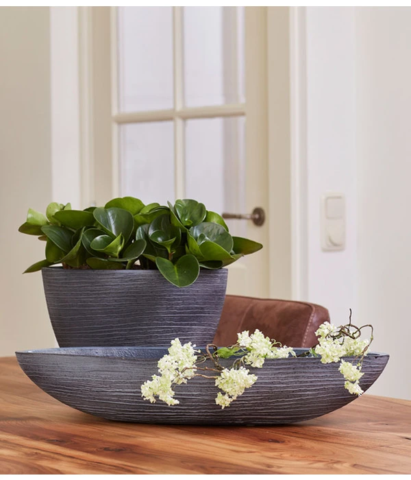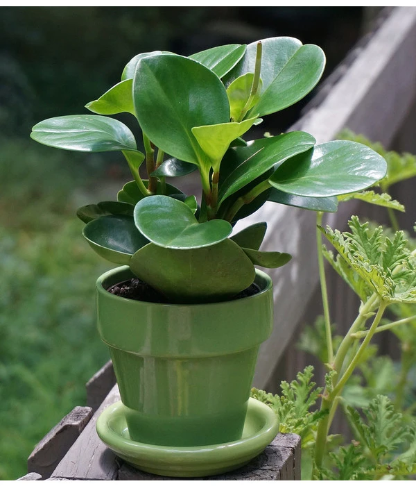 Die Peperomie gehört zur Gattung der Pfeffergewächse, deshalb ist sie auch unter den Namen Zwerg- oder Zierpfeffer bekannt. Es gibt etwa 1.600 Peperomia-Arten und jede dieser Sorten hat ihren ganz eigenen Look. Während sich die einen, in einem kräftigen Grün präsentieren, zeigen andere rote bis braune, oder sogar zweifarbige Blätter. Aber nicht nur in der Blattfarbe unterscheiden sich die verschiedenen Arten, auch die Blattform- und struktur ist enorm vielfältig – ob klein und rund oder lang und spitz, dünn bis fleischig dick, glatt oder gerunzelt, die Peperomie hat alles im Repertoir. Dieser Zwergpfeffer hat kurzgestielte, eiförmige Blätter, die in saftigem Grün glänzen. Die leicht sukkulenten Eigenschaften machen ihn obendrein zu einer pflegeleichten Zimmerpflanze.