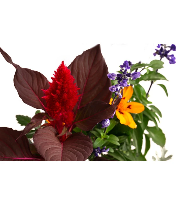 Gerade für Vollzeit-Berufstätige ist es oftmals schwer noch Zeit zu finden, um mit Beet- oder Balkonblumen das Zuhause noch schön zu dekorieren. Doch ganz ohne sommerlicher Blumen-Deko geht es nicht. Deshalb gibt es bei Dehner nun das Potpourri aus vier verschiedenen Sommerblühern. Darunter hat sich eine Studentenblume mit gelb-orangen Blüten gemischt, daneben der Feuersalbei mit flackerndem Blattwerk und leuchtend roter Blüte. Für etwas Struktur sorgt das silbergrüne, gefiederte Laub des Silberblatts und für tollen Kontrast der Dauerblüher Mehlsalbei mit seinen dunklen Blütenkerzen. Zusammen ergibt der Sommer-Mix Sunset eine bunte Vielfalt beliebter Pflanzen, die Terrasse und Balkon den ganzen Sommer über in ein Blumenmeer verwandeln.