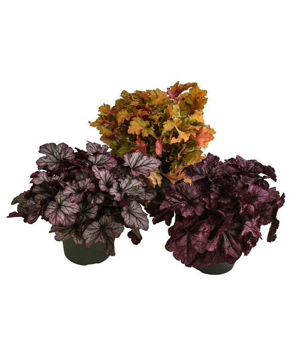Je 1 x Heuchera ‘Marmalada‘, Heuchera ‘Black Pearl‘, Heuchera ‘Forever Purple‘