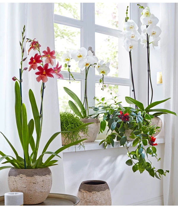 Orchideen bevorzugen einen hellen Standort, ohne direkte Sonne. Auch halbschattige Plätze wie zum Beispiel Ost- oder Westfenster sind ideal geeignet. Südfenster sind dagegen nicht beliebt, denn die pralle Sonne behagt den tropischen Pflanzen nicht und sorgt unter Umständen für Blattverbrennungen. Halten Sie die Phalaenopsis nicht zu feucht, gießen Sie 1x wöchentlich oder tauchen Sie Ihre Pflanzen bestanfalls kurz in zimmerwarmen, kalkarmen Wasser. Staunässe führt im schlimmsten Falle zu Wurzelfäulnis, weshalb Sie ihrer Pflanze einen speziellen Orchideentopf zur Verfügung stellen sollten. Im Winter können Sie die Wassergaben reduzieren. Düngen Sie in der Wachstumszeit, von Mai bis Oktober, zweiwöchentlich mit dem Dehner Orchideen-Dünger. Erhöhen Sie die Luftfeuchtigkeit, indem Sie die Blätter der Orchidee mit weichem Wasser besprühen. Nach der Blüte sollten Sie bei der Phalaenopsis die Blütenrispe über einem schlafenden Auge abknipsen, an dieser Stelle wird die Pflanze erneut Blütentriebe bilden.