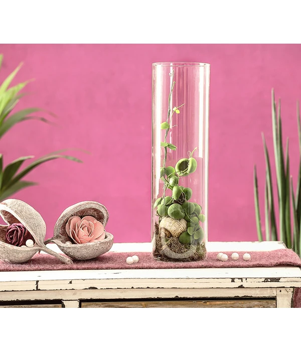 Das ist kein Deko-Trick, den Sie hier sehen! Diese interessanten Pflanzen benutzen auch in ihrer Heimat Thailand auf den dortigen Reisfeldern leere Schneckenhäuser als Wohnung und beginnen zu wachsen. Und ist schon diese Tatsache ausreichend, um die Schneckenhauspflanze ‚Snaily‘ zu etwas ganz Besonderem zu machen. So werden Sie überrascht sein, wenn sie sich unter guten Bedingungen sogar ab und zu mit kleinen weißlichen Blüten schmückt. Doch auch die dicken, innen hohlen Blätter der dekorativen Kriechpflanze sind eine Schau und dienen zugleich als Wasserspeicher für die ansonsten sehr genügsame Pflanze. Sie erhalten die Dischidia in einem Glaszylinder mit einer Höhe von 38 cm und einem Durchmesser von 11 cm. In diesem schlichten Glashaus kommt die originelle Schneckenhauspflanze ‚Snaily‘ besonders schön zur Geltung und wird in vielen Räumen zum bewunderten Hingucker. Die Kriechpflanze eignet sich übrigens auch als tolle Dekoration für Terrarien.