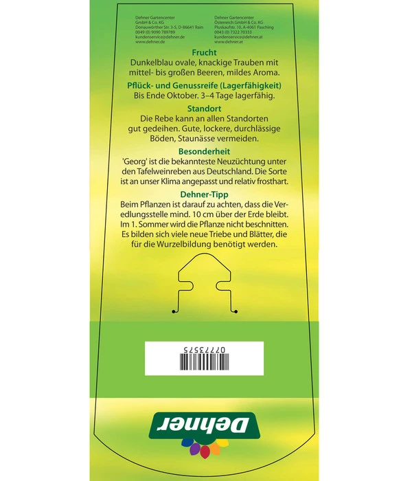 Wer kennt sie nicht, die meterlangen Weinberge in mediterranen Regionen. Holen Sie sich doch Ihren eigenen Traubentraum in den Garten. Mit der Weinsorte ‚Georg‘ haben Sie eine sehr robuste Sorte gewählt. Sie ist widerstandsfähig gegen Fröste und Krankheiten und wird deshalb von Liebhabern sehr geschätzt. Die mittelfrühe Weinsorte trägt ihre Früchte zwischen September und Oktober. Diese sind groß, dunkelblau, oval und knackig. Geschmacklich können die fruchtig, milden Trauben auch punkten. Es gibt kein Bukett, das ist der Geruch bei Trauben. Nach der vier bis fünf wöchigen Ernte können die Trauben natürlich roh verzehrt werden oder auch verarbeitet werden. Durch ihren kräftigen Wuchs schafft es die Kletterpflanze sehr schnell Mauern zu begrünen.