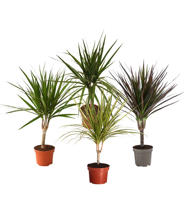 Kaum eine Zimmerpflanze ist so bekannt, pflegeleicht und geduldig wie ein Drachenbaum. Schön anzusehen sind die Mini-Wohnungsdrachen ganz nebenbei auch noch. Wenn Sie noch keinen haben sollten, dann wird es höchste Zeit und mit dem 4-teiligen Set Drachenhöhle holen Sie sich gleich vier Schönheiten nach Hause. Übrigens ist Drachenbaum nicht nur der deutsche Name, auch die botanische Bezeichnung dracaena stammt von einem griechischen Wort ab, das so viel wie „weiblicher Drache“ bedeutet, treffender könnte dieses Set also gar nicht benannt sein. Für Ihre ganz eigene Drachenhöhle ziehen vier kleine Pflanzen bei Ihnen ein, jede für sich eine Schönheit mit ganz eigenen Blättern. Typisch Drachenbaum haben die Zimmerpflanzen einen oder mehrere „Stämme“, aus denen viele Blätter wachsen. Das macht die Drachenbäume auch zu perfekten kleinen Raumteilern, wenn Sie sie nebeneinander stellen.