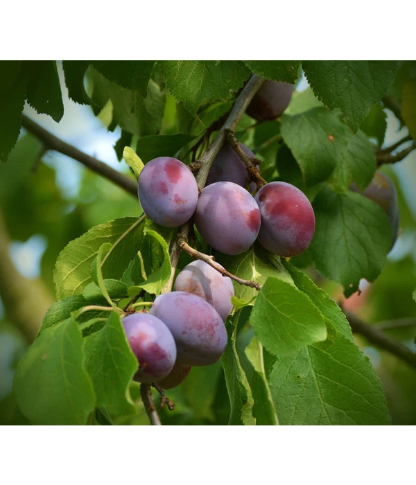 Wow! Dieses Frucht-Duo zieht alle Blicke auf sich. Eine Mischung aus gelben Mirabellen und violetten Zwetschgen zeigt sich an dem stark wachsenden Fruchtbaum. Dieser Farbkontrast lässt den Baum zwischen August und September strahlen. Denn dann sind die Früchte reif und können geerntet werden. Die Mirabellen ‚von Nancy‘ leuchten wie kleine gelbe Sonnen, sind süß, fruchtig und besitzen ein festes Fruchtfleisch. Schönberger-Zwetschgen werden auch ‚Große Hauszwetschgen‘ genannt, sie besitzen eine lila-rote Farbe und bringen reiche Erträge. Das Fruchtfleisch ist goldgelb, aromatisch und sehr saftig. Es lässt sich außerdem gut vom Stein lösen. Beide Sorten sind Selbsbefruchter, weswegen Sie keinen zweiten Obstbaum benötigen. Was gibt es Besseres als einen Obstbaum mit zwei unterschiedlichen Sorten an Früchten auf einmal. Ihre ganze Familie wird die leckeren Früchte lieben.